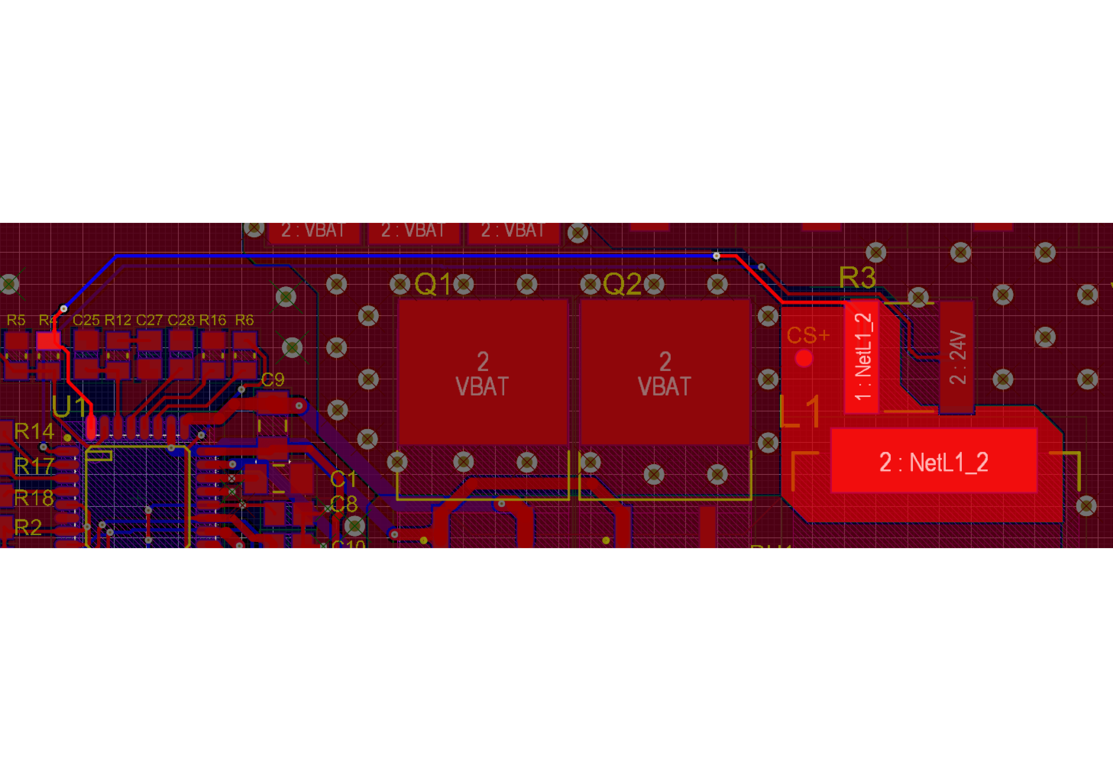 The board is 4 layers, with two routing layers and two power planes. One of the power planes is GND and the other is split between VBAT and 24V. All of the polygons that are poured above a power plane with the same net also have via stitching to electrically connect the polygons and the planes together to maximize current pathways.