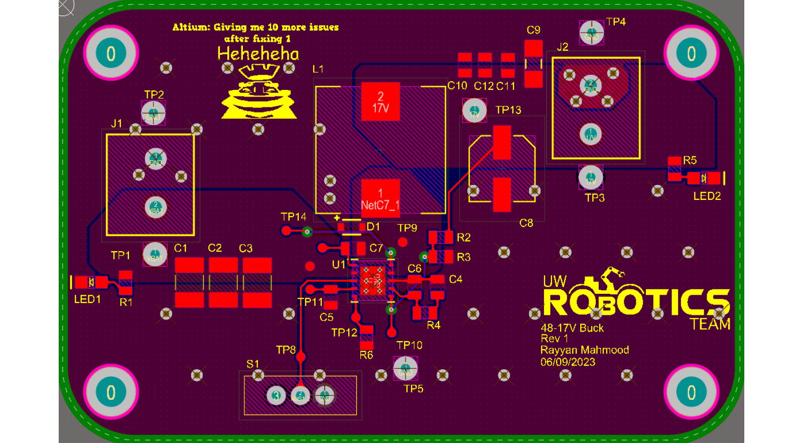 Melissa was going to work on the 5V buck converter, Rayyan would work on the 17V buck converter and I would work on the baseboard which the buck converter modules would plug into. Since this was Melissa and Rayyan’s first PCB designs, I created these Board Development Paths for them to follow as they completed their designs and for me to track their progress.