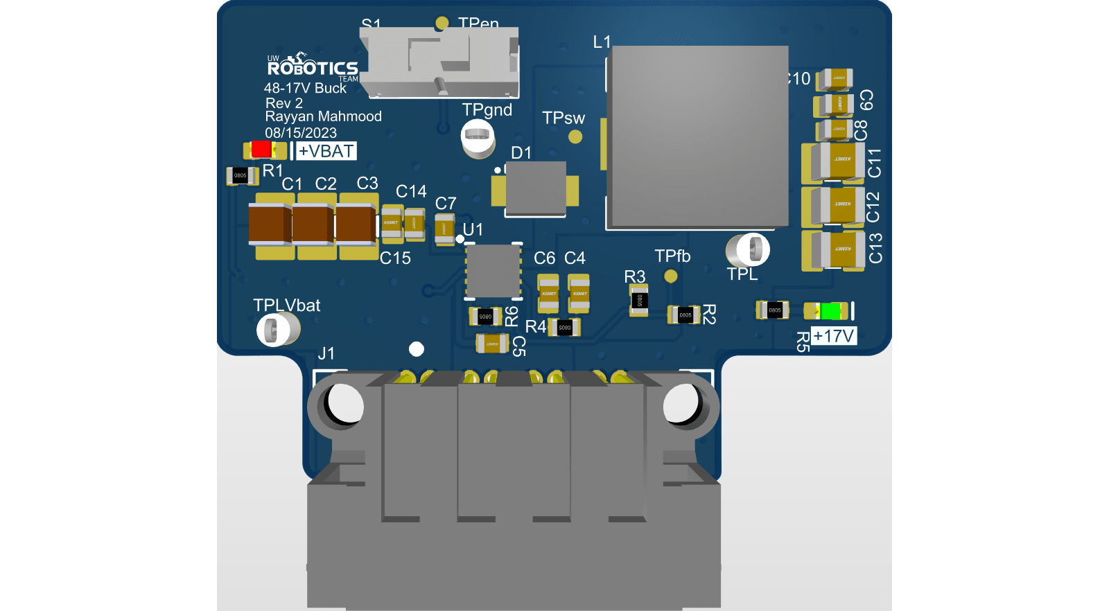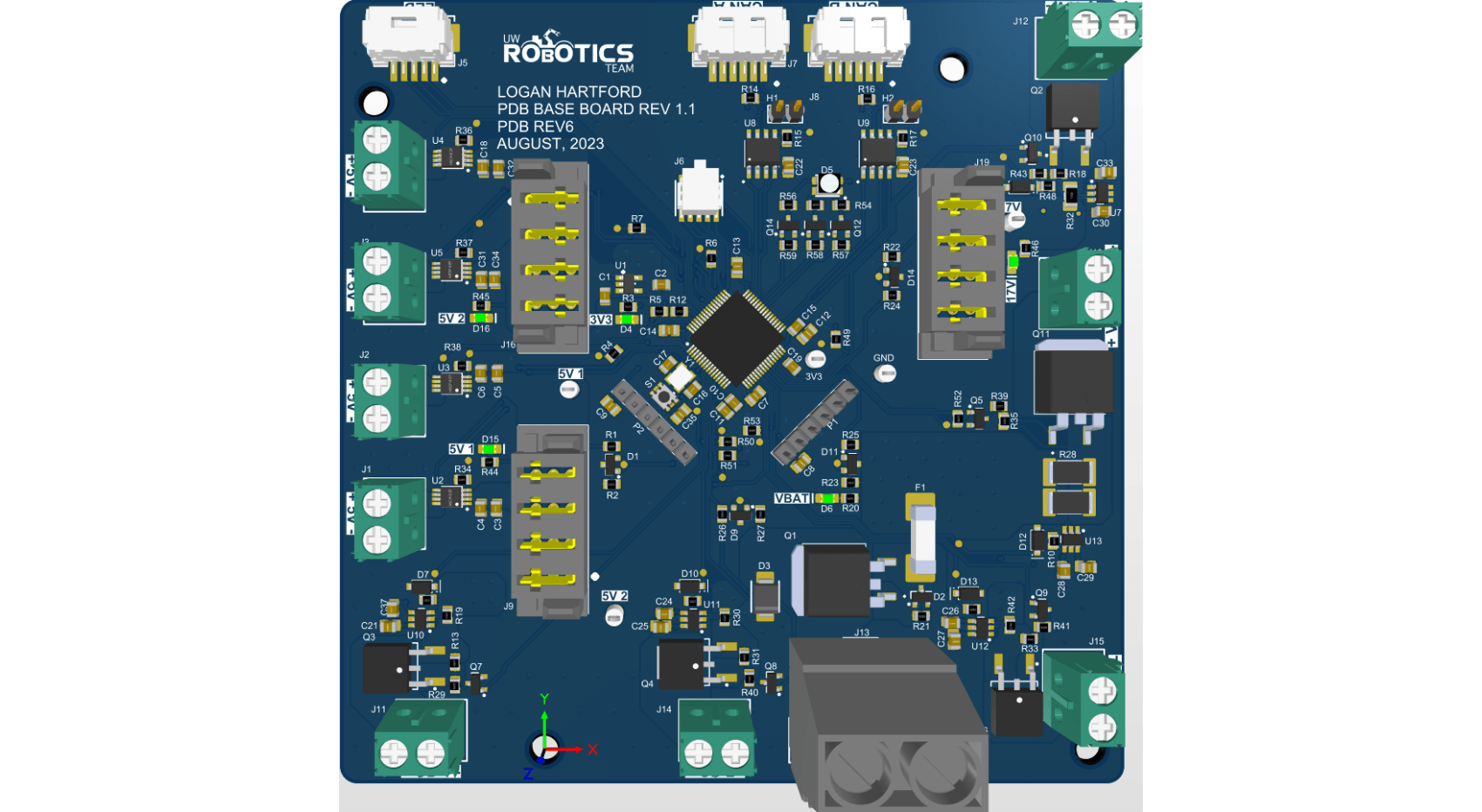 The PDB is the most critical custom PCB on the rover. It is responsible for accepting 48V from the battery and distributing 48V to the drive train, converting (48-17V) and supplying power to out main computer a Jetson Xavier and converting (48-5V) and supplying power to our science module. Without a functioning PDB, our electrical architecture becomes very messy and bloated trying to use off the shelf parts to replace this single compact board.