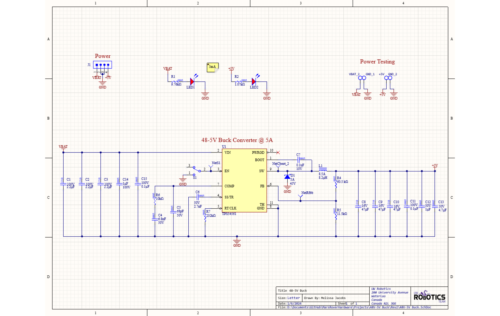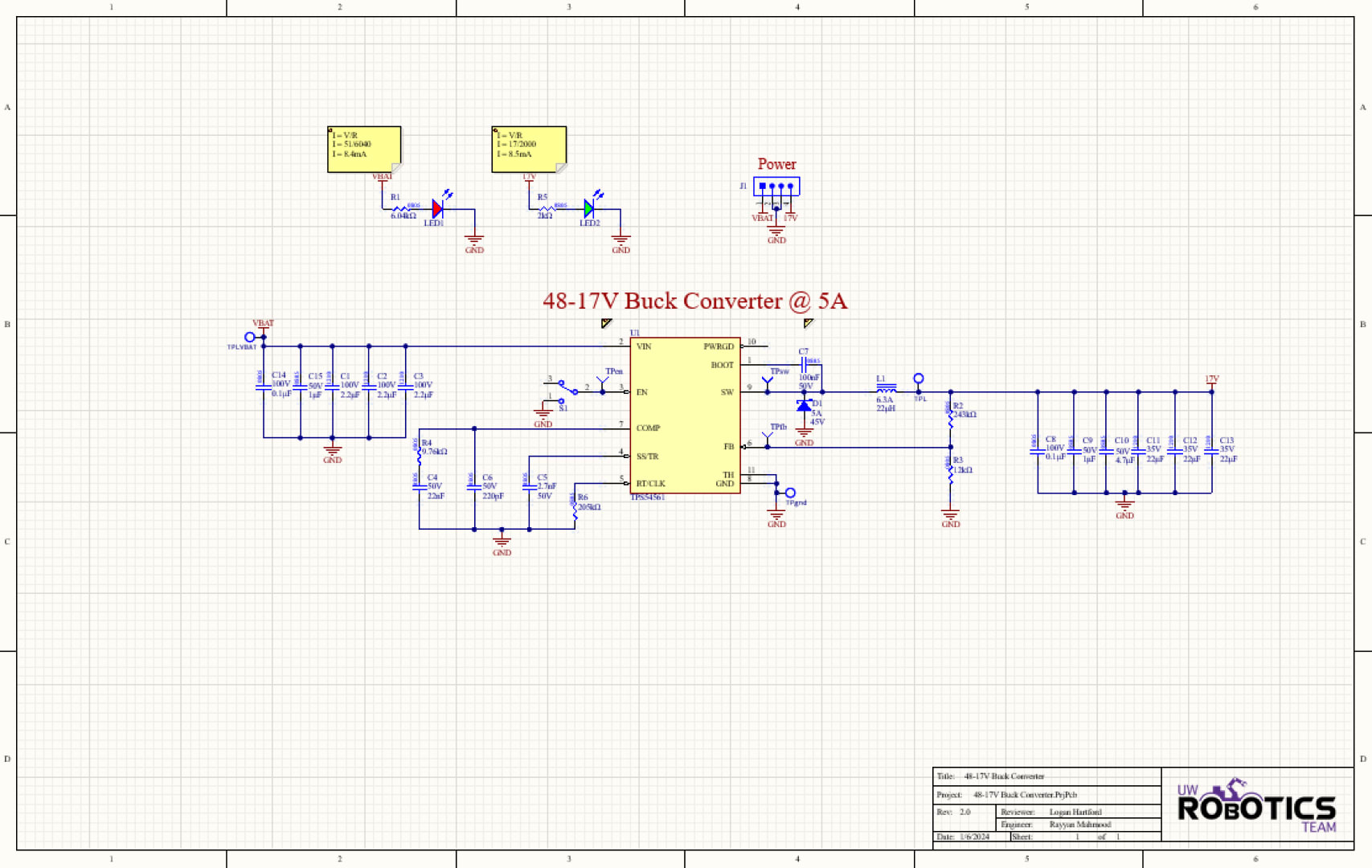 The schematics for the 5V and 17V buck converters were created by Melissa and Rayyan respectively. They generated their designs using WeBench (5V | 17V) and then transferred to Altium.