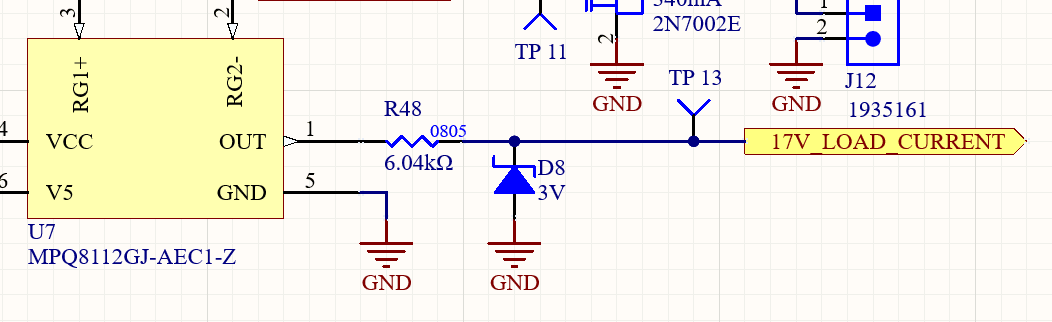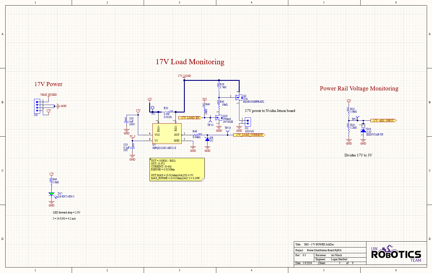 The previous revisions did not have any load monitoring for the 48V system. To protect our 48V motor drivers (ODrives) which are very expensive, I added a terminal for each of the 3 ODrives on the rover and gave them each a load monitoring circuit.