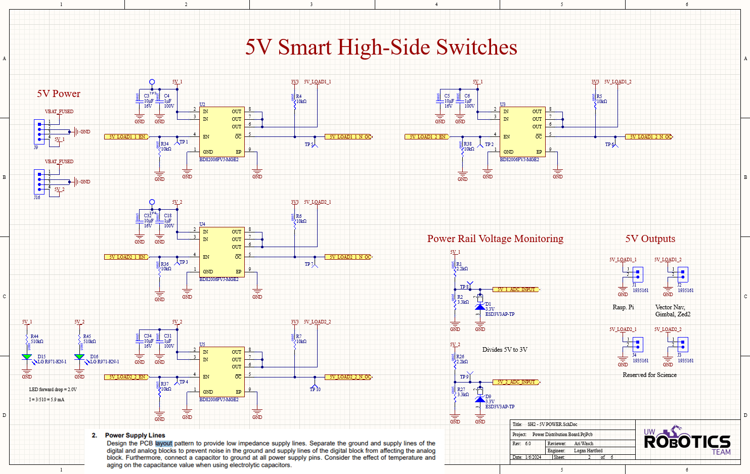 In the previous revision, the 5V system had been broken into 4 outputs, each monitored by a smart-highside switch. These switches worked in in the last revision so I left them as is. The main change to the 5V system was the removal of the buck circuit and the addition of the B2B connector.
